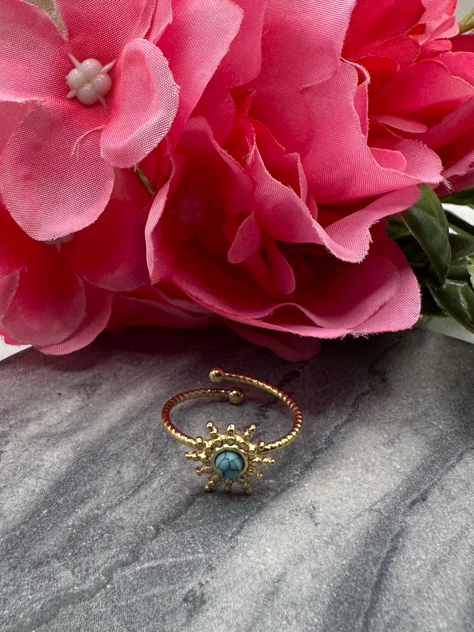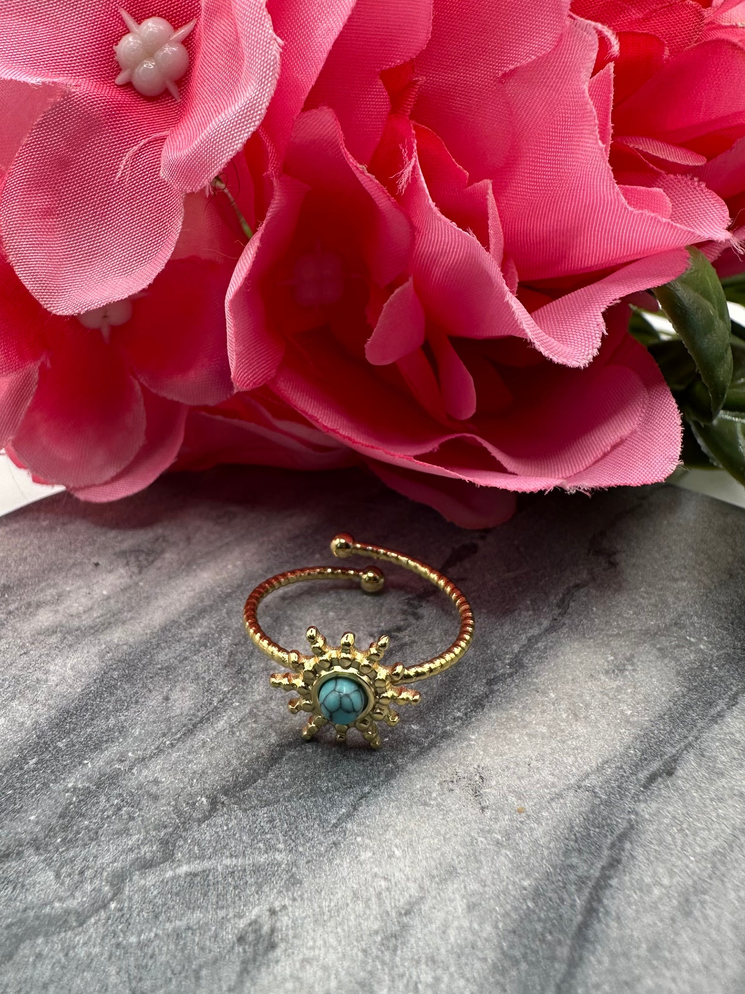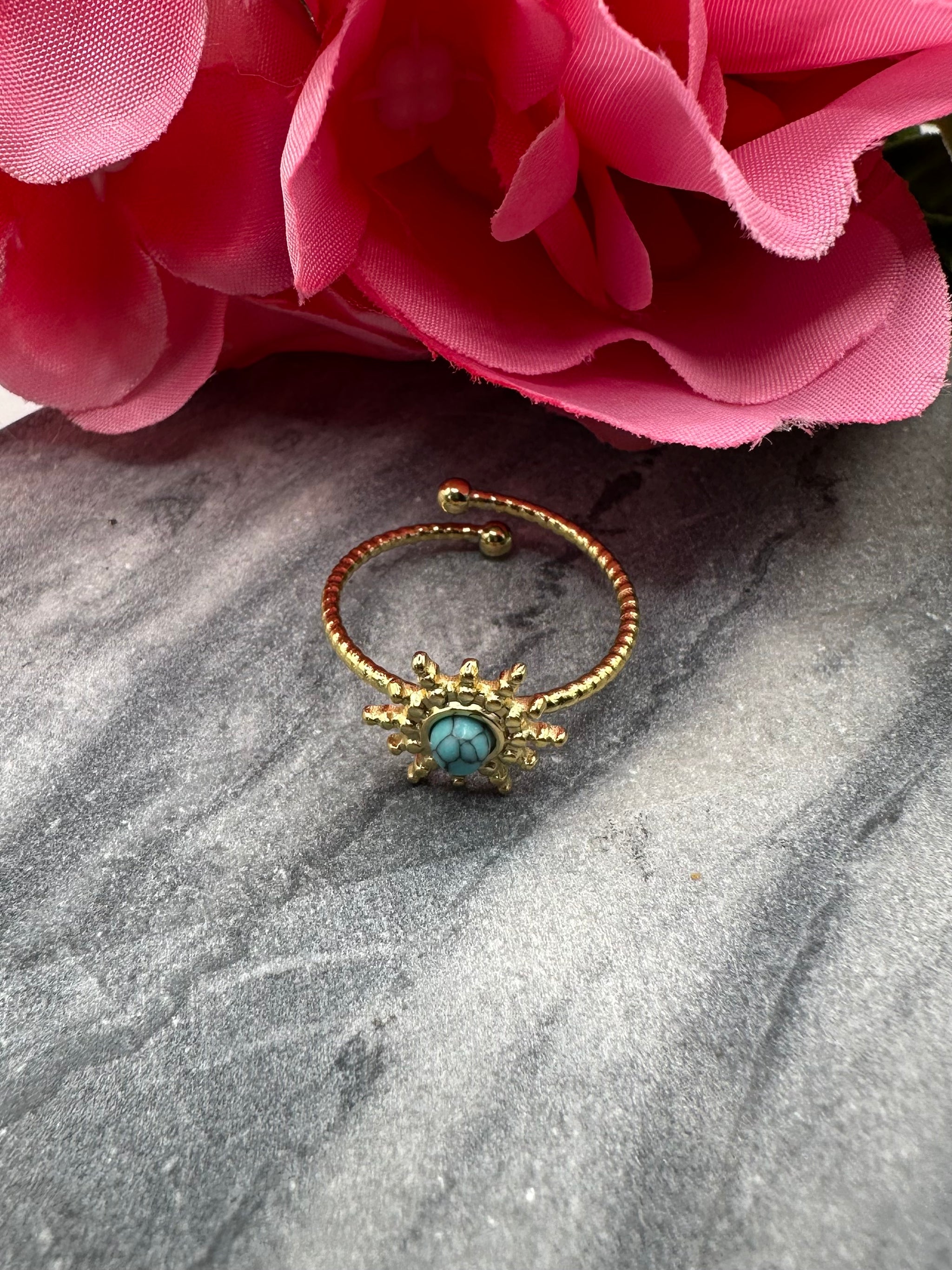 Rayonnez d’énergie et de lumière avec cette magnifique bague dorée soleil, sublimée par une pierre turquoise symbole de sérénité et de protection 🌞💎