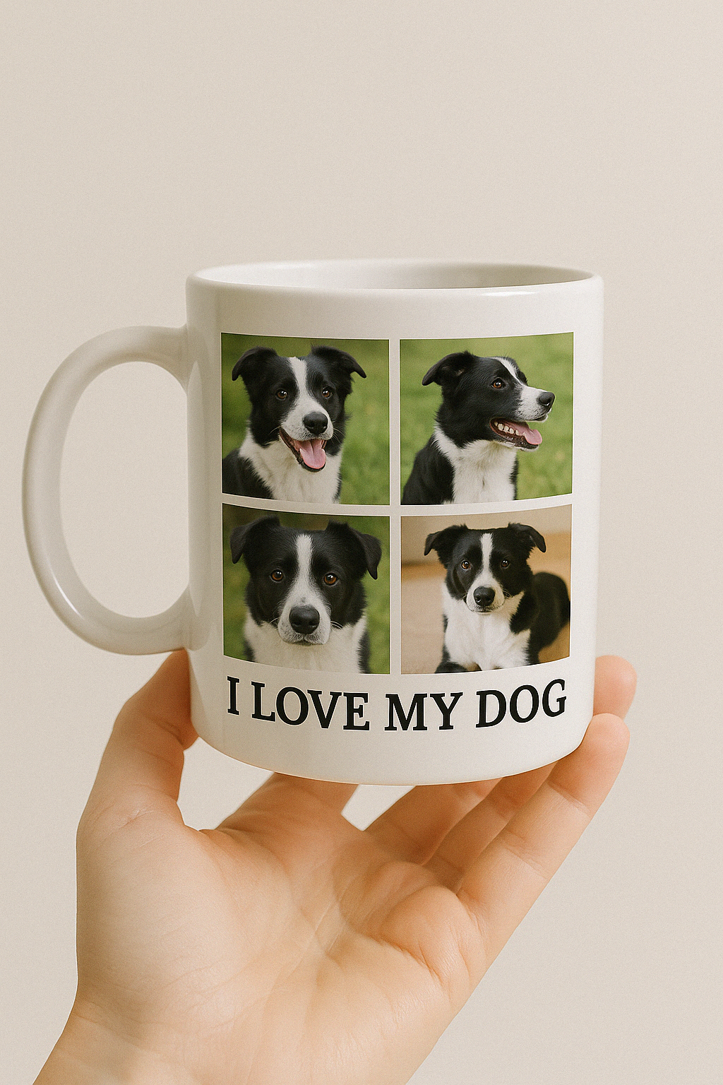 Mug personnalisé 4 photos + texte – Animaux, Famille, Couple, Amis